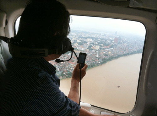 Một hành khách chụp hình từ trên trực thăng Bell 429 WLG trong chuyến bay trải nghiệm.