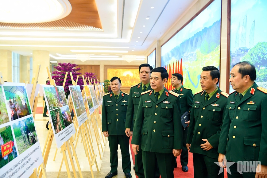 Đại tướng Phan Văn Giang và các đại biểu tham quan triển lãm ảnh về công tác khắc phục hậu quả bom mìn sau chiến tranh ở Việt Nam. Ảnh: TUẤN HUY