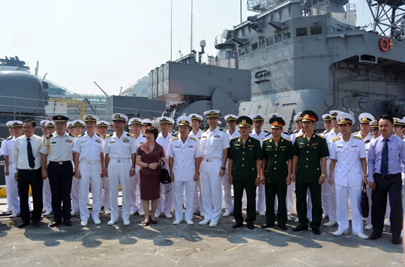 Lãnh đạo các cơ quan, đơn vị của Việt Nam chụp ảnh lưu niệm cùng nhóm chỉ huy tàu tàu huấn luyện JS Setoyuki và JS Shimayuki. |