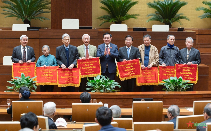 Tại cuộc gặp, Chủ tịch Quốc hội Vương Đình Huệ và các đồng chí Phó chủ tịch Quốc hội đã trao bức trướng mừng thọ 95 tuổi, 85 tuổi, 80 tuổi, 75 và 70 tuổi tới các đồng chí nguyên lãnh đạo Quốc hội, nguyên Ủy viên Ủy ban Thường vụ Quốc hội và các đồng chí cán bộ đã nghỉ hưu.