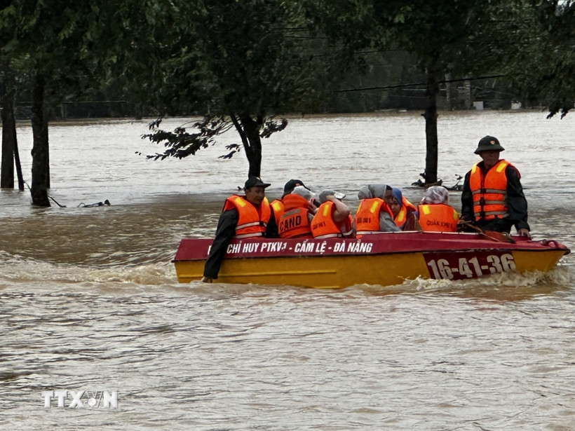 | Lực lượng chức năng dùng ca nô đưa người dân ra khỏi vùng ngập lũ nguy hiểm. |