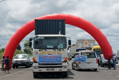 Phương tiện vận tải đi qua cửa khẩu Hoa Lư (Việt Nam) – Trapeang Sre (Cam-pu-chia) trong ngày thông xe.