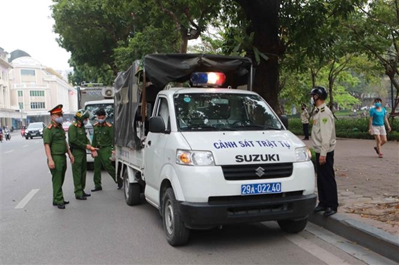 Lực lượng chức năng Quận Hoàn Kiếm (Hà Nội) tuyên truyền, vận động người dân nghiêm túc đeo khẩu trang và không tụ tập đông người nơi công cộng. Ảnh: TTXVN.