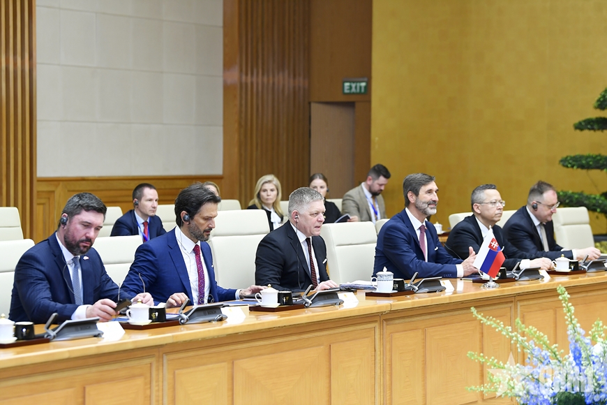 | Thủ tướng Robert Fico và đoàn đại biểu cấp cao Slovakia tại hội đàm. Ảnh: TUẤN HUY |