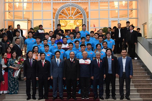 Thủ tướng Nguyễn Xuân Phúc và Phó thủ tướng Vũ Đức Đam với các cầu thủ Đội tuyển bóng đá U23 Việt Nam.