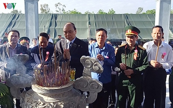 Thủ tướng Nguyễn Xuân Phúc chia sẻ việc hôm nay về đây với tư cách không chỉ là Thủ tướng mà đặc biệt là với tư cách của người con được sinh ra ở mảnh đất này, ông càng thấm thía hơn sự hy sinh của các Anh hùng Liệt sĩ đối với công cuộc giải phóng, giữ gìn non sông. Vì vậy, Thủ tướng mong muốn, mọi người dân đất Việt phải làm những việc lớn hơn, vĩ đại hơn, cấp bậc cao hơn để đất nước tiến bước trên nền tảng văn hóa cơ bản của dân tộc ta, một tinh thần yêu nước cách mạng không khuất phục trước kẻ thù của các đồng chí đã ngã xuống.