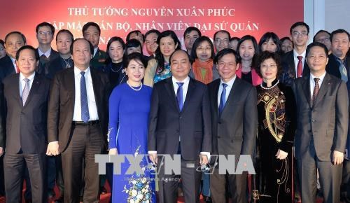 Vui mừng gặp gỡ cán bộ, nhân viên Đại sứ quán Việt Nam tại Ấn Độ, Thủ tướng Nguyễn Xuân Phúc đánh giá, với quyết tâm và tinh thần trách nhiệm cao, Đại sứ quán đã làm tốt các nhiệm vụ mà Đảng, Nhà nước và Chính phủ giao cho. Thông tin về tình hình kinh tế xã hội của đất nước năm 2017 với những thành tựu toàn diện và vượt mức, nhiều kỷ lục về kinh tế - thương mại được xác lập, Thủ tướng Nguyễn Xuân Phúc nhấn mạnh trong bối cảnh gặp rất nhiều khó khăn nhất là 16 cơn bão lớn dồn dập trong năm vừa qua, nhưng đất nước vẫn đạt được những thành tựu rất đáng trân trọng. Quốc phòng, an ninh được giữ vững. Năm Diễn đàn Hợp tác Kinh tế châu Á - Thái Bình Dương (APEC) 2017 và đặc biệt là Tuần lễ Cấp cao APEC được tổ chức hết sức thành công, nâng cao vị thế của Việt Nam trên trường quốc tế và được bạn bè, cộng đồng quốc tế ghi nhận, đánh giá cao.