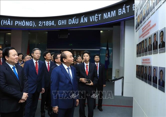 Thủ tướng Nguyễn Xuân Phúc và các đại biểu tham quan Phòng truyền thống của Tập đoàn Điện lực Việt Nam. |