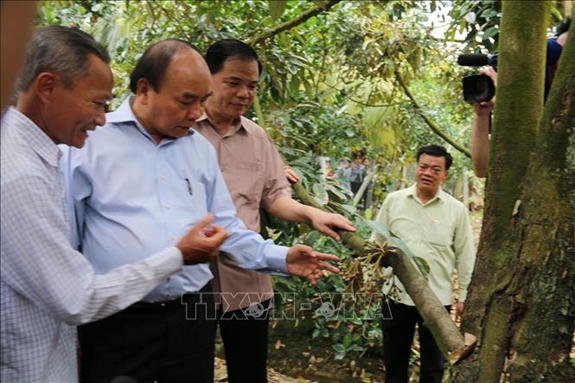 Thủ tướng Nguyễn Xuân Phúc khảo sát thực tế tại vườn sầu riêng của anh Trần Văn Phúc ở xã Hiệp Đức, huyện Cai Lậy, tỉnh Tiền Giang. Ảnh: TTXVN |