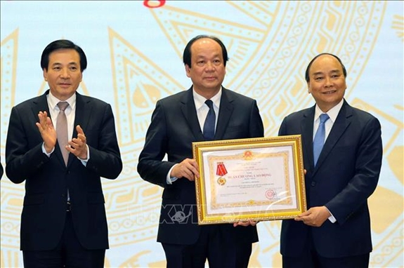 Thủ tướng Nguyễn Xuân Phúc trao Huân chương Lao động hạng Nhất của Chủ tịch nước tặng Văn phòng Chính phủ. Ảnh:TTXVN.