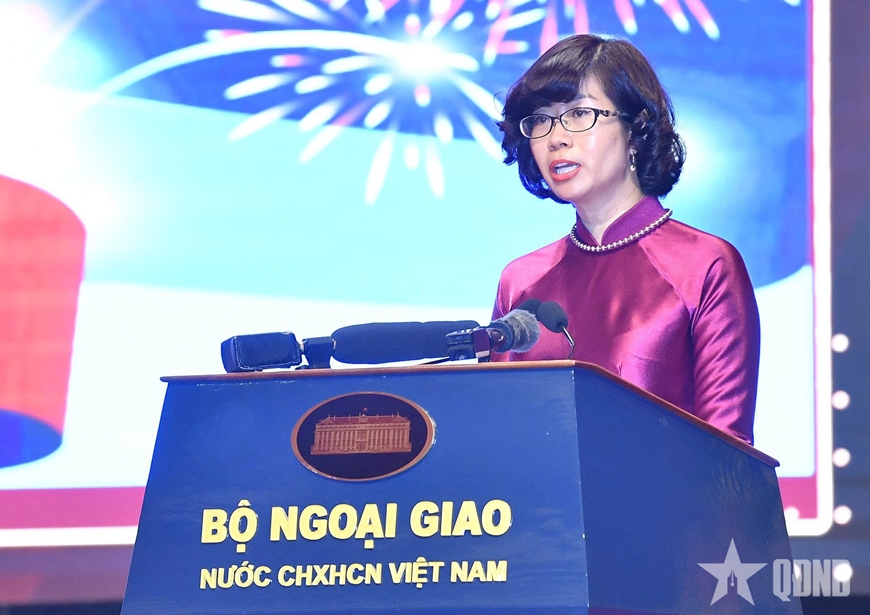 | Thứ trưởng Thường trực Bộ Ngoại giao Nguyễn Minh Vũ phát biểu tại đại hội. Ảnh: TRỌNG HẢI |