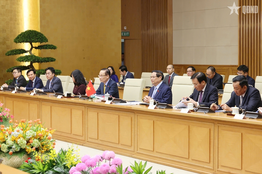 | Thủ tướng Phạm Minh Chính và các thành viên đoàn Việt Nam tại cuộc hội kiến. Ảnh: TRỌNG HẢI |