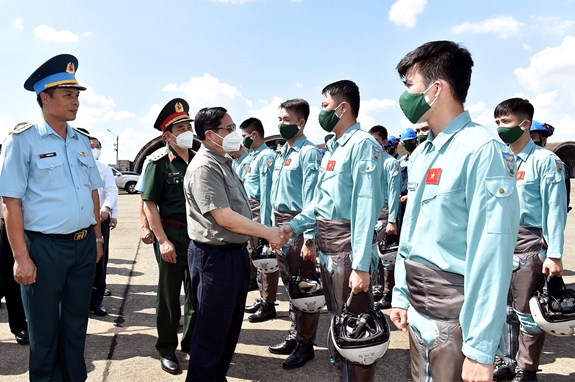 Thủ tướng Phạm Minh Chính, Bộ trưởng Bộ Quốc phòng Phan Văn Giang thăm hỏi, động viên cán bộ, chiến sĩ Trung đoàn 935, Sư đoàn 370, Quân chủng Phòng không-Không quân. Ảnh: NHẬT BẮC
