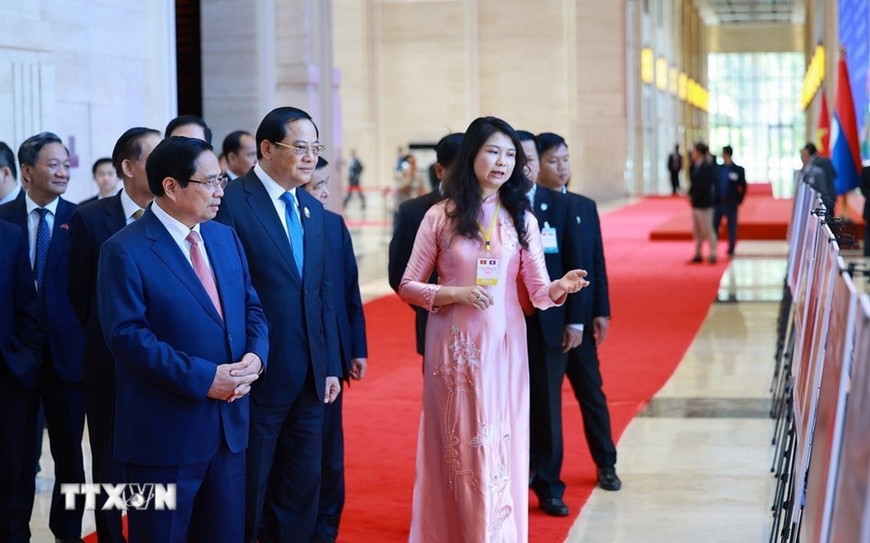 Thủ tướng Phạm Minh Chính và Thủ tướng Sonexay Siphandone tham quan trưng bày ảnh về quan hệ hợp tác giữa hai nước.