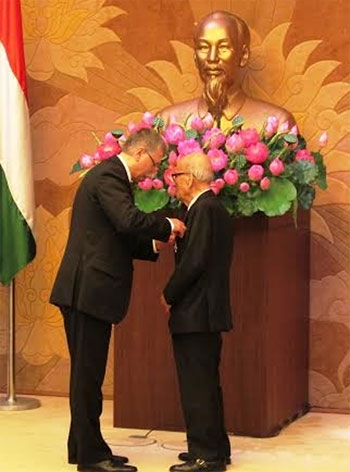 Chủ tịch QH Kover Laszlo trao Huân chương Chữ thập Hiệp sĩ Hungary tặng Giáo sư Vũ Khiêu.