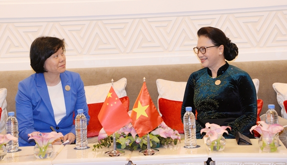 Chủ tịch Quốc hội Nguyễn Thị Kim Ngân và Phó chủ tịch Nhân đại Trung Quốc tại cuộc tiếp. |