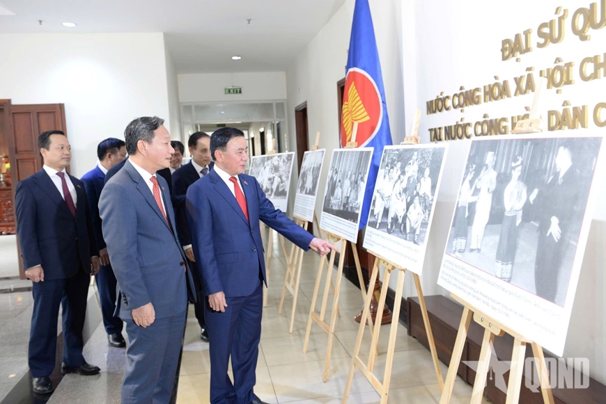 | Thường trực Ban Bí thư Trần Cẩm Tú tham quan triển lãm ảnh tại buổi gặp gỡ cán bộ Đại sứ quán Việt Nam và cộng đồng người Việt Nam tại Lào. |