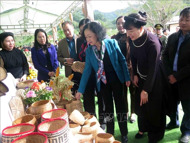 Thường trực Ban Bí thư Trương Thị Mai tham quan gian giới thiệu sản phẩm nông nghiệp nông thôn của nhân dân xóm Mỏ Gà. |
