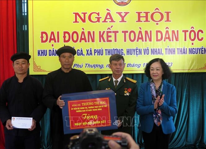 Trong không khí vui mừng phấn khởi của Ngày hội Đại đoàn kết, Thường trực Ban Bí thư Trương Thị Mai cùng các thành viên trong Đoàn công tác và lãnh đạo tỉnh Thái Nguyên gửi tặng nhiều phần quà ý nghĩa tới xóm Mỏ Gà, các cá nhân, gia đình chính sách và các em học sinh… trên địa bàn.