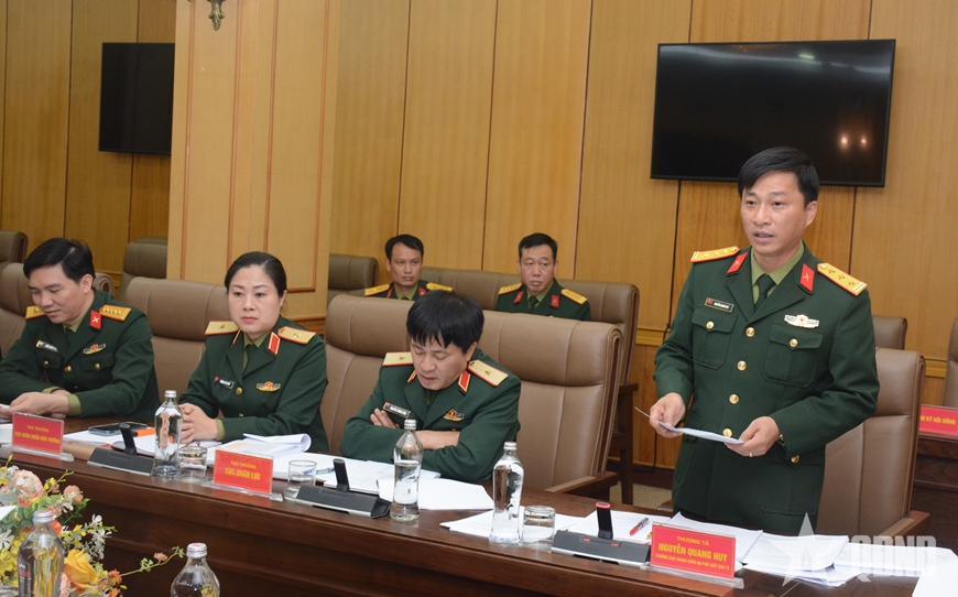 | Thượng tá Nguyễn Quang Huy, Trưởng ban Thanh niên Quân đội đại diện Cơ quan Thường trực báo cáo, làm rõ một số nội dung trước Hội đồng. |
