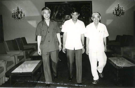 | Từ trái sang phải: Bộ trưởng Bộ Ngoại giao Nguyễn Cơ Thạch, Bộ trưởng Bộ Ngoại giao Campuchia Hun Sen và Bộ trưởng Bộ Ngoại giao Lào Phoune Sipaseuth tại Hội nghị Bộ trưởng Bộ Ngoại giao Campuchia - Lào - Việt Nam lần thứ 11 tại Phnom Penh (tháng 8-1985). Ảnh: TTXVN |