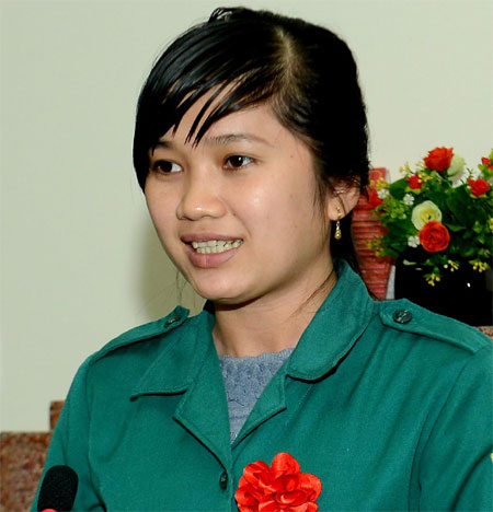 Nữ dân quân Trần Thị Tuyết Mai, dân quân xã Lộc Giang, huyện Đức Hòa (tỉnh Long An) - đại biểu dự Đại hội Thi đua yêu nước đến thăm, phát biểu tại Báo QĐND.