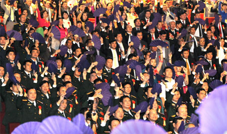 Các đại biểu giương cao quạt giấy hưởng ứng Chương trình "Quạt cho phong trào lớn mạnh" như lời kêu gọi của Chủ tịch Hồ Chí Minh.