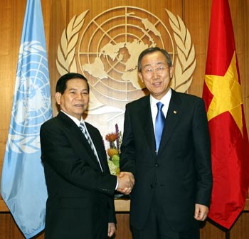 Tổng thư ký LHQ Ban Ki Mum tiếp Chủ tịch nước Nguyễn Minh Triết tại trụ sở Liên hợp quốc ở Niu Y-oóc. Ảnh: TTXVN .