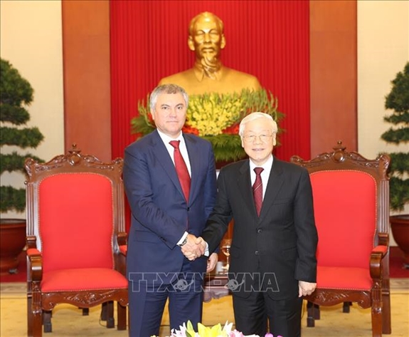 Chủ tịch Duma Quốc gia Nga bày tỏ vui mừng lần đầu tiên thăm Việt Nam và được gặp lại Tổng Bí thư, Chủ tịch nước Nguyễn Phú Trọng; trân trọng chuyển lời chào thân thiết của Tổng thống Nga V. Putin và các lãnh đạo cao cấp của Nga tới Tổng Bí thư, Chủ tịch nước Nguyễn Phú Trọng. Nhắc lại những ấn tượng tốt đẹp trong các cuộc tiếp xúc với Tổng Bí thư nhân chuyến thăm chính thức Liên bang Nga vào tháng 9 vừa qua, ngài V.V.Volodin khẳng định, Duma Quốc gia Nga luôn ủng hộ thúc đẩy quan hệ Đối tác chiến lược toàn diện với Việt Nam.