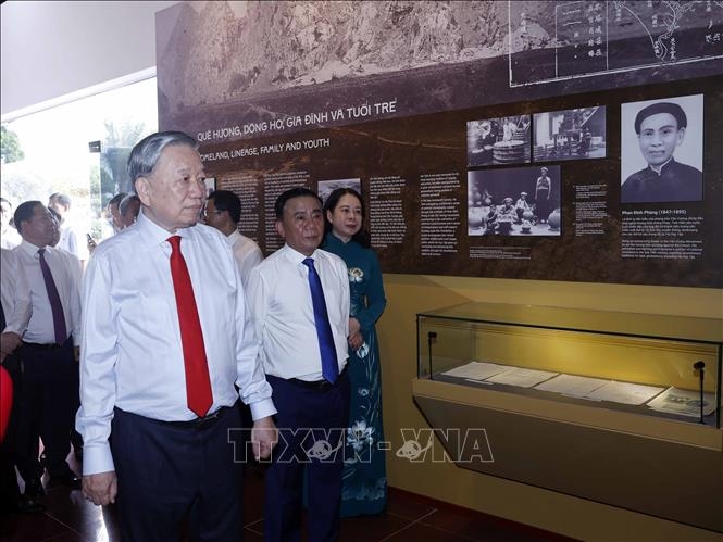 Tổng Bí thư, Chủ tịch nước Tô Lâm và các đồng chí lãnh đạo Đảng, Nhà nước tại Khu di tích Tổng Bí thư Hà Huy Tập ở xã Cẩm Hưng, tỉnh Hà Tĩnh.