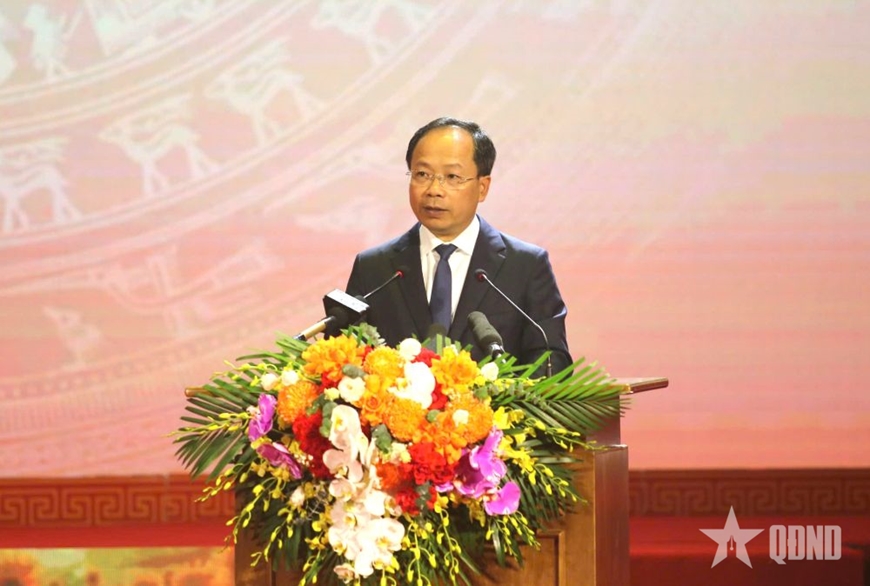 | Đồng chí Nguyễn Duy Lâm, Ủy viên Trung ương Đảng, Bí thư Tỉnh ủy Hà Tĩnh trình bày diễn văn tại lễ kỷ niệm. |