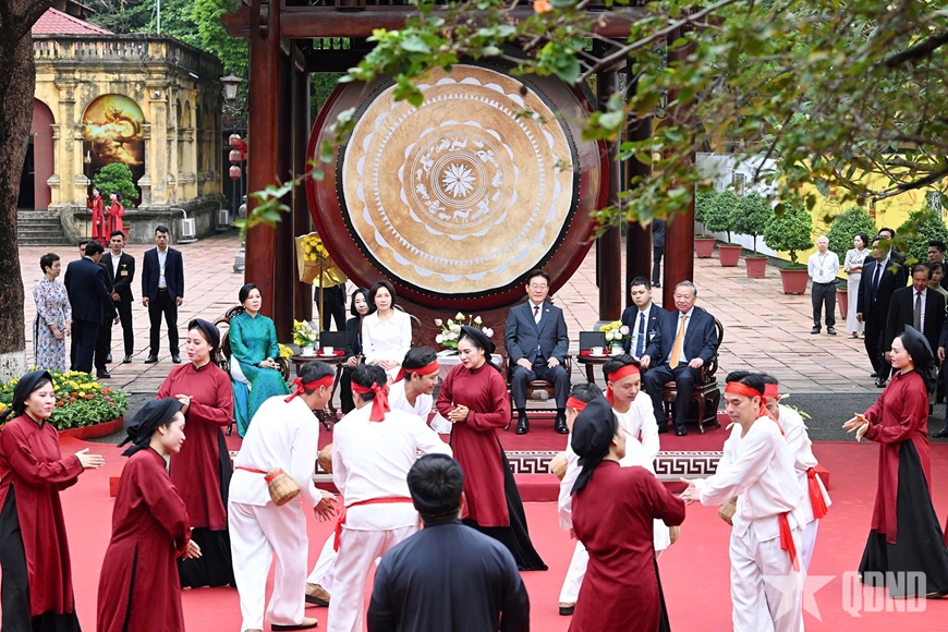 Trong bầu không khí văn hóa truyền thống, với không gian trà lễ mang tính thanh nhã, Tổng Bí thư, Chủ tịch nước Tô Lâm, Tổng thống Hàn Quốc Lee Jae Myung và hai phu nhân cùng thưởng trà, trao đổi thân mật, xem chương trình biểu diễn nghệ thuật truyền thống.