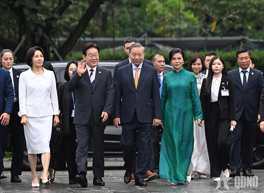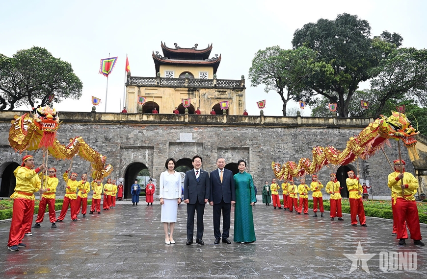 Trong không khí gần gũi và thân tình, thắm tình hữu nghị, Tổng Bí thư, Chủ tịch nước Tô Lâm và Tổng thống Hàn Quốc Lee Jae Myung cùng hai phu nhân đã di chuyển tới Cổng thành Đoan Môn. Đây là một trong những cổng thành chính dẫn lối vào Cấm thành Thăng Long - nơi ở và sinh hoạt của 52 vị tiên đế và hoàng gia trong liên tục 800 năm.
