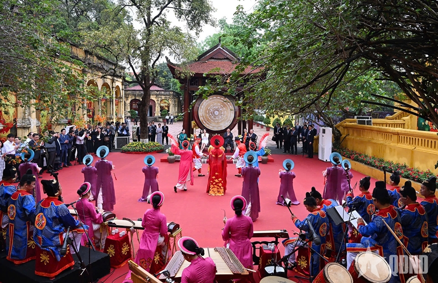 Tại Hoàng thành Thăng Long, chào đón đoàn là tiếng trống hội vang lên mở đầu nghi lễ, gợi nhắc truyền thống lễ nhạc cung đình vốn là biểu tượng của sự trang nghiêm và thịnh vượng, với tiết mục múa lân truyền thống mang ý nghĩa cầu chúc may mắn, biểu trưng cho hòa bình và thịnh trị, thường xuất hiện trong các dịp lễ trọng đại của quốc gia.