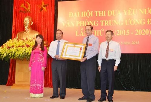 QĐND Online – Sáng 7-8, Đại hội thi đua yêu nước Văn phòng Trung ương Đảng lần thứ III (2015-2020) đã diễn ra tại Hà Nội. Đến dự đại hội có các đồng chí: Tổng Bí thư Nguyễn Phú Trọng; Ủy viên Bộ Chính trị, Thường trực Ban Bí thư Lê Hồng Anh; Bí thư Trung ương Đảng, Chánh Văn phòng Trung ương Đảng Trần Quốc Vượng. Cùng dự có đại diện các ban, ngành Trung ương và 74 điển hình tiên tiến (ĐHTT) của Văn phòng Trung ương Đảng 5 năm qua. Đại hội lần này nhằm đánh giá thực chất phong trào thi đua yêu nước, công tác khen thưởng 5 năm qua (2010-2015); đề ra phương hướng, nhiệm vụ công tác thi đua khen thưởng 5 năm tới; tôn vinh, khen thưởng các tập thể, cá nhân ĐHTT tiêu biểu, xuất sắc; tiếp tục đẩy mạnh phong trào thi đua yêu nước, xây dựng cơ quan, đơn vị ngày càng vững mạnh, hoàn thành xuất sắc nhiệm vụ chính trị được giao.