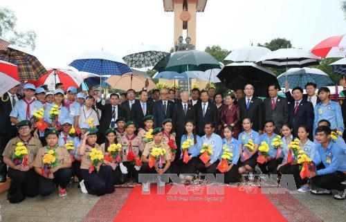 Tổng Bí thư Nguyễn Phú Trọng và Chủ tịch Thượng viện Cam-pu-chia Samdech Say Chhum với các đại biểu và học sinh tại Tượng đài Hữu nghị Việt Nam- Cam-pu-chia. Ảnh: TTXVN