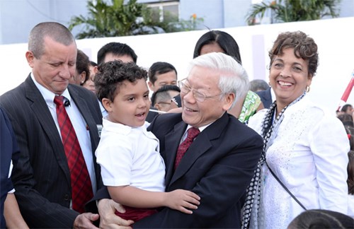 Tổng Bí thư Nguyễn Phú Trọng và học sinh Cuba ở Trường Tiểu học Võ Thị Thắng. |
