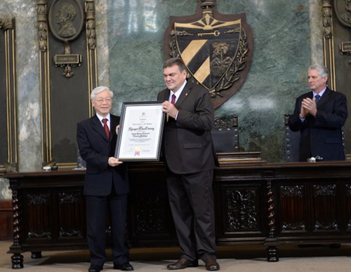 Hiệu trưởng Trường Đại học Tổng hợp La Habana trao Bằng Tiến sĩ danh dự tặng Tổng Bí thư Nguyễn Phú Trọng.
