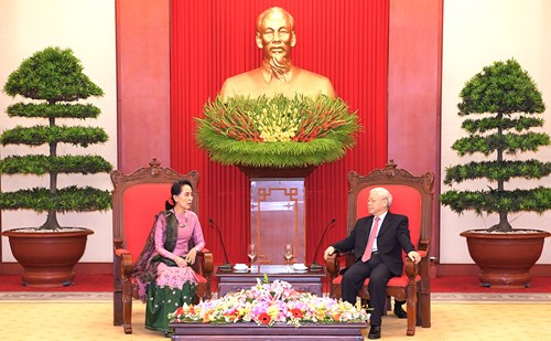 Tổng Bí thư Nguyễn Phú Trọng nhiệt liệt hoan nghênh chuyến thăm chính thức Việt Nam của Cố vấn Nhà nước Myanmar Aung San Suu Kyi; đánh giá cao sự phát triển của quan hệ giữa hai nước trong thời gian qua và tin tưởng chuyến thăm Việt Nam lần này của bà Aung San Suu Kyi sẽ là dấu mốc quan trọng, góp phần thúc đẩy hơn nữa quan hệ hữu nghị và hợp tác nhiều mặt giữa hai nước. Tổng Bí thư Nguyễn Phú Trọng khẳng định chính sách nhất quán của Việt Nam là coi trọng tăng cường và mở rộng quan hệ hữu nghị và hợp tác nhiều mặt với Myanmar; hoan nghênh kết quả hội đàm giữa bà Aung San Suu Kyi với Thủ tướng Nguyễn Xuân Phúc, đề nghị hai bên đẩy mạnh hợp tác trên tất cả các lĩnh vực, nhất là trong những lĩnh vực tiềm năng như thương mại, đầu tư và giao lưu văn hóa cũng như trong khuôn khổ ASEAN và các diễn đàn khu vực và quốc tế, vì hòa bình, ổn định, hợp tác và phát triển ở khu vực và trên thế giới.