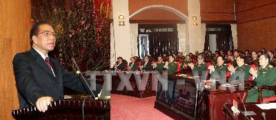 Tổng Bí thư Nông Đức Mạnh phát biểu tại buổi thăm và chúc Tết Bộ Quốc phòng.