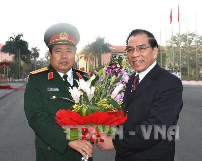 Bộ trưởng Bộ Quốc phòng Phùng Quang Thanh tặng hoa Tổng Bí thư Nông Đức Mạnh.