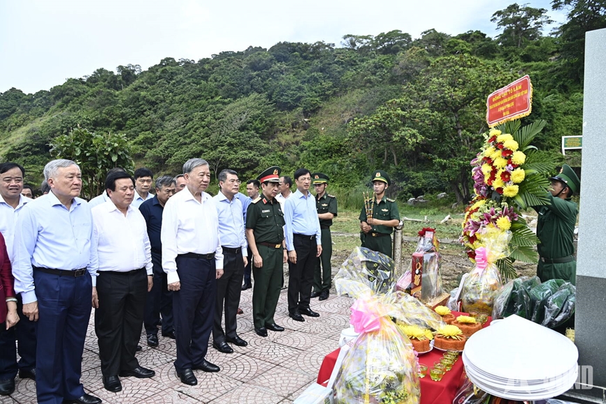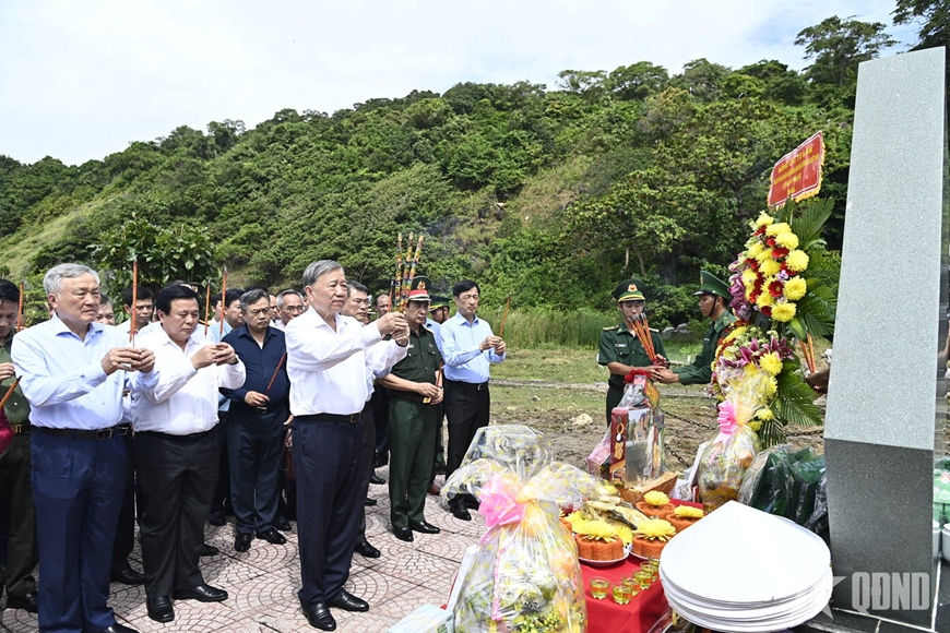 Tại khu di tích, trong không khí trang nghiêm, Tổng Bí thư Tô Lâm và đoàn công tác đã dâng hương tưởng niệm, bày tỏ lòng biết ơn sâu sắc đối với những người con ưu tú đã ngã xuống vì độc lập, tự do của Tổ quốc. Tiếp bước khí phách tiền nhân, đoàn công tác nguyện gìn giữ và phát huy truyền thống cách mạng vẻ vang của dân tộc; kiên định con đường mà Đảng, Bác Hồ và các thế hệ đi trước đã lựa chọn; giữ vững chủ quyền biển, đảo thiêng liêng của Tổ quốc, phát triển Hòn Khoai trở thành trung tâm chiến lược về kinh tế biển, văn hóa và du lịch của cả nước.