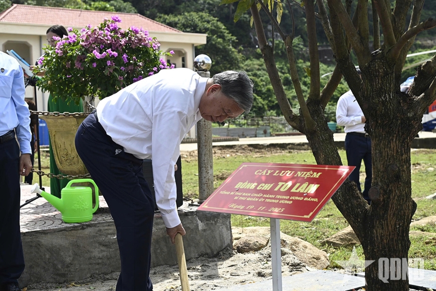 | Tổng Bí thư Tô Lâm trồng cây lưu niệm phía sau khu tưởng niệm. |