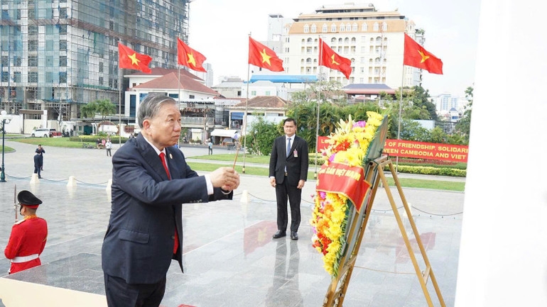 Trong khuôn khổ chuyến thăm cấp Nhà nước tới Vương quốc Campuchia, sáng 6-2, Tổng Bí thư Tô Lâm đã tới đặt vòng hoa tại Đài Độc lập, Đài tưởng niệm cố Quốc vương Norodom Sihanouk và Đài Hữu nghị Campuchia - Việt Nam ở Thủ đô Phnom Penh.
