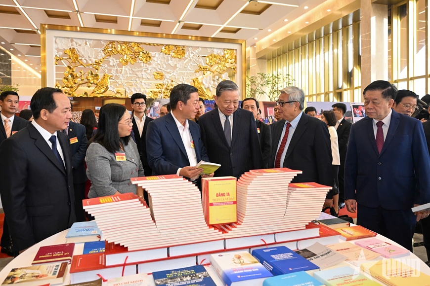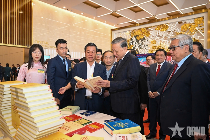 | Tổng Bí thư Tô Lâm và các đại biểu tham quan không gian trưng bày sách, triển lãm ảnh và thành tựu chuyển đổi số trong báo chí tại Trung tâm Triển lãm Quốc gia. |