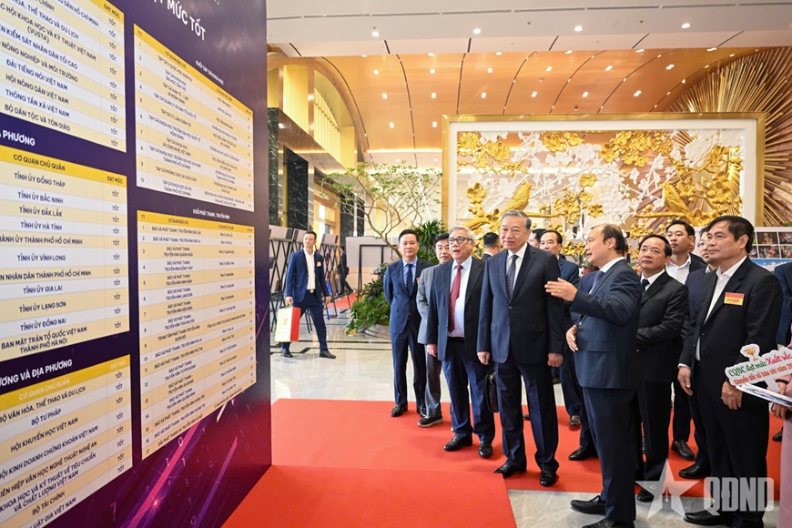 | Tổng Bí thư Tô Lâm và các đại biểu tham quan khu vực đánh giá chuyển đổi số báo chí năm 2025. |