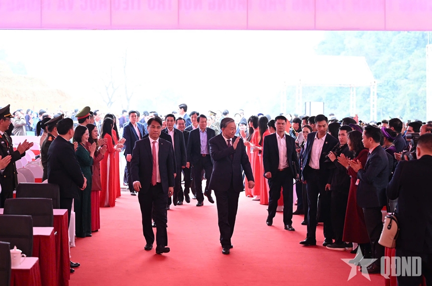 Phát biểu tại buổi lễ, Tổng Bí thư Tô Lâm bày tỏ vui mừng được cùng các đồng chí lãnh đạo Trung ương về thăm Trường Hà, mảnh đất gắn liền với Pác Bó, nơi ghi dấu bước ngoặt lịch sử của cách mạng Việt Nam. Tổng Bí thư khẳng định, Pác Bó-Trường Hà không chỉ là một địa danh lịch sử mà còn là biểu tượng thiêng liêng của ý chí độc lập, tinh thần tự lực tự cường và khát vọng vươn lên của dân tộc Việt Nam.