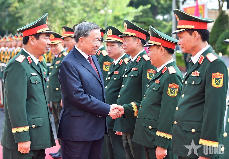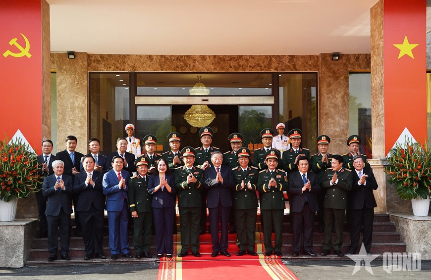 Tổng Bí thư Tô Lâm, Bí thư Quân ủy Trung ương và các đồng chí lãnh đạo Đảng, Nhà nước, Quân đội với các đại biểu tại Bộ tư lệnh Quân khu 1. |