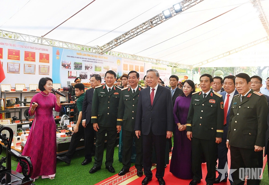 Tổng Bí thư Tô Lâm và các đại biểu tham quan gian trưng bày tại lễ kỷ niệm. |