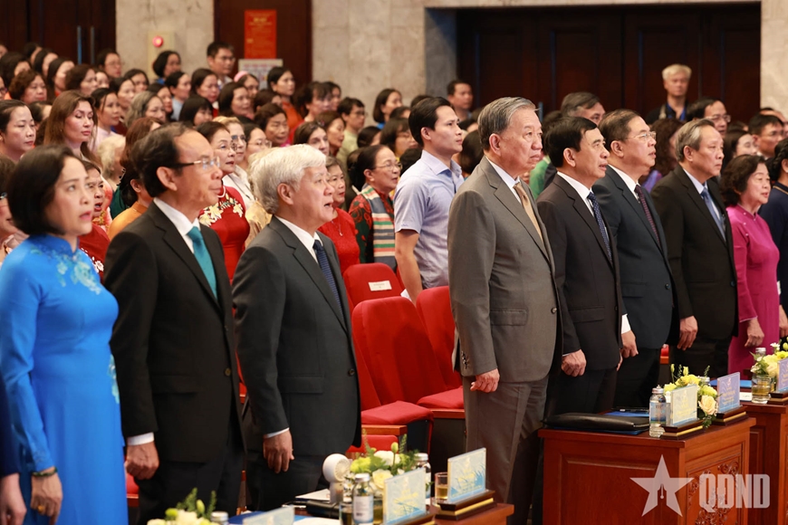 Nhân dịp này, Tổng Bí thư Tô Lâm trao tặng Hội Liên hiệp Phụ nữ Việt Nam Huân chương Lao động hạng Nhất vì đã có thành tích xuất sắc tiêu biểu trong đổi mới nội dung, phương thức hoạt động, để thực hiện tốt việc đại diện chăm lo, bảo vệ quyền và lợi ích hợp pháp, chính đáng của phụ nữ, góp phần tích cực thực hiện mục tiêu phát triển kinh tế - xã hội đất nước giai đoạn 2020-2025.
